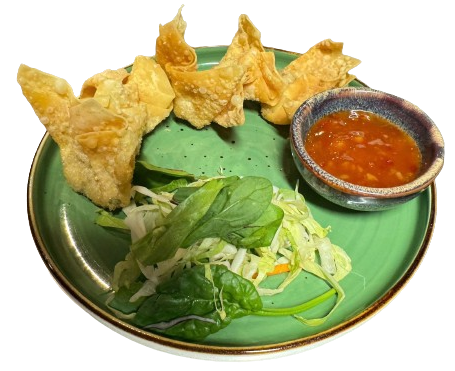 Knusprig gebackene Wan Tan Teigtaschen gefüllt mit gemahlenen Garnelen, Hühnerfleisch und Gewürzen, serviert mit Salatgarnitur und süß saurem Dip