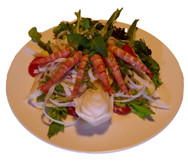 Mango, Garnelen, Limetten Sauce, Karotten, Mischsalat, Erdnüsse ,Koriander, Zwiebeln, Salat