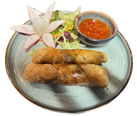 Hausgemachte Reisrollen knusprig gebacken und gefüllt mit Hackfleisch, Ei, Morcheln, Glasnudeln, Gemüse serviert mit Salatgarnitur und Chili-Limelen-Ingwer Dip